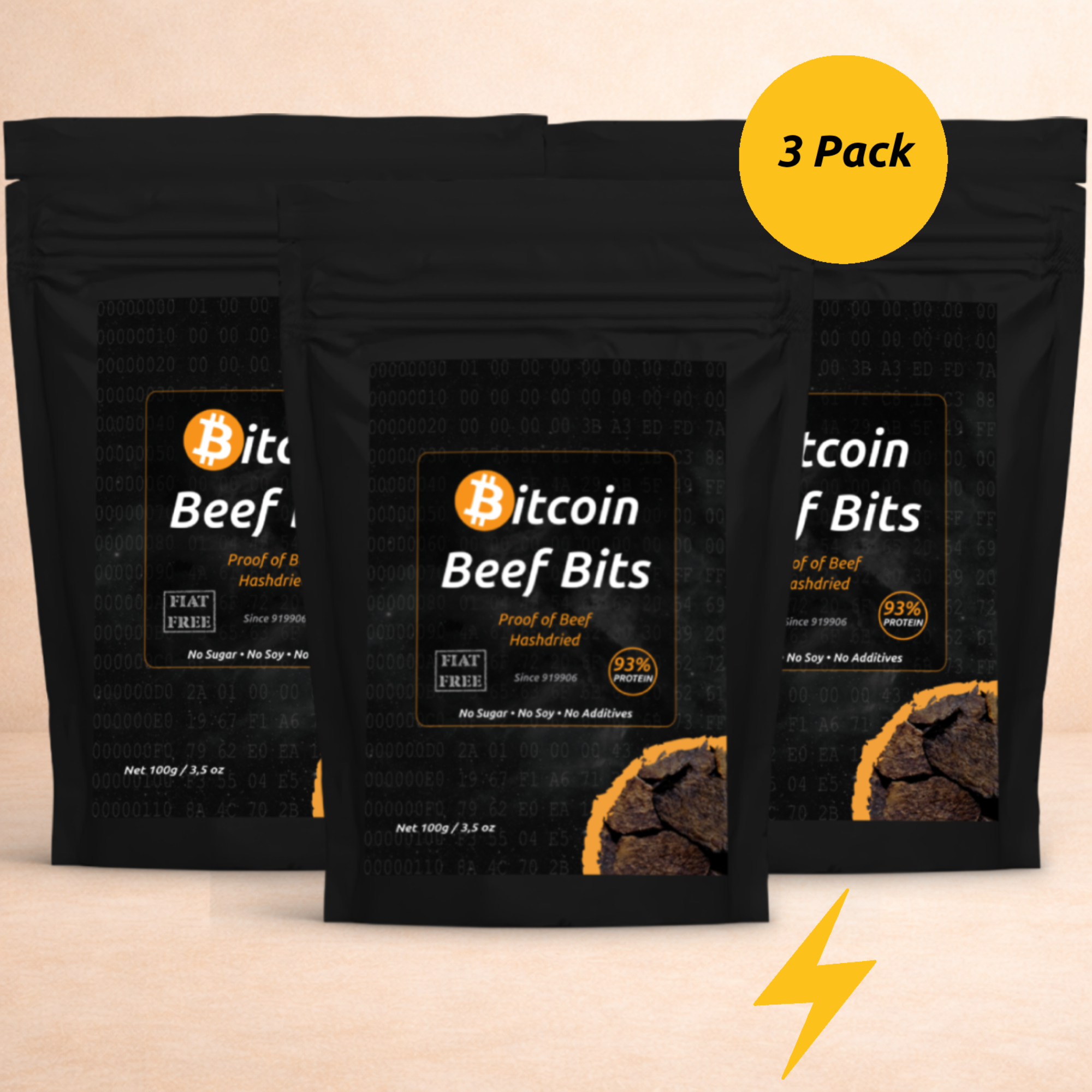 Bitcoin Beef Bits Pleb Bundle of 3 packs, for stackers on the go. The world’s first premium beef snack hash-dried with Bitcoin miner heat. Proof of Beef!